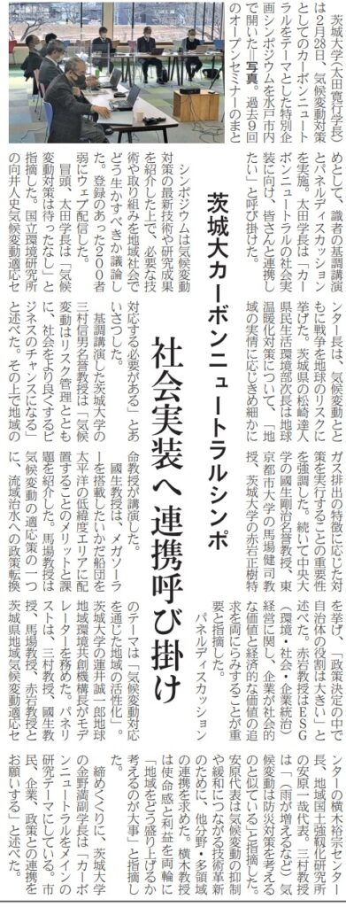 日刊工業新聞に,茨城大学とLRRIが共同で開催したカーボンニュートラル特別シンポジウム(2/28)の様子が掲載されました。